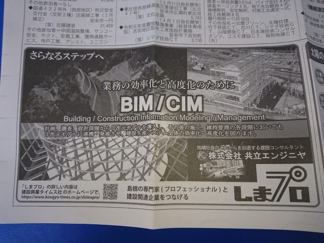 4/8付、建設興業タイムスにBIM/CIMの広告を掲載しました。