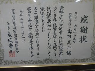 市道古浦西長江線開通の「感謝状」を頂きました。