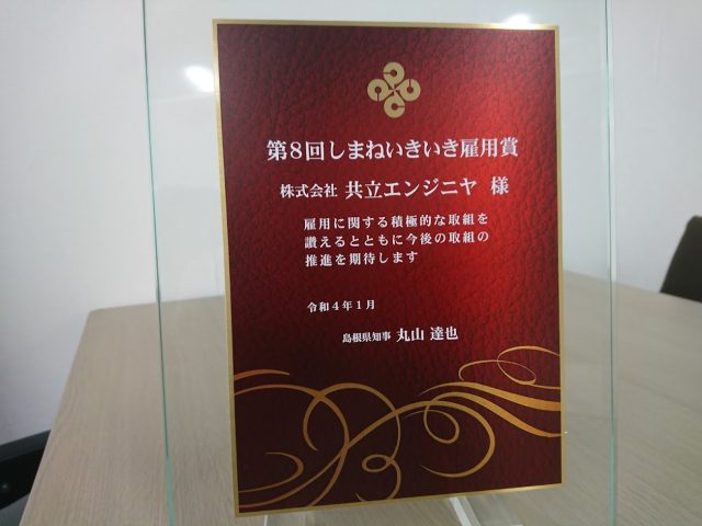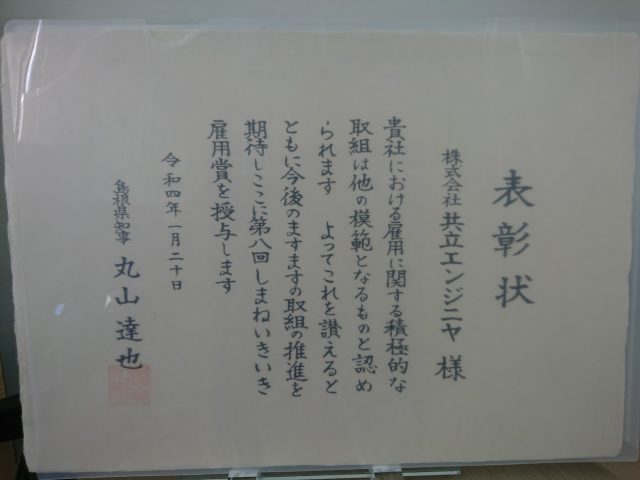 第8回しまねいきいき雇用賞の表彰状と盾を頂きました。