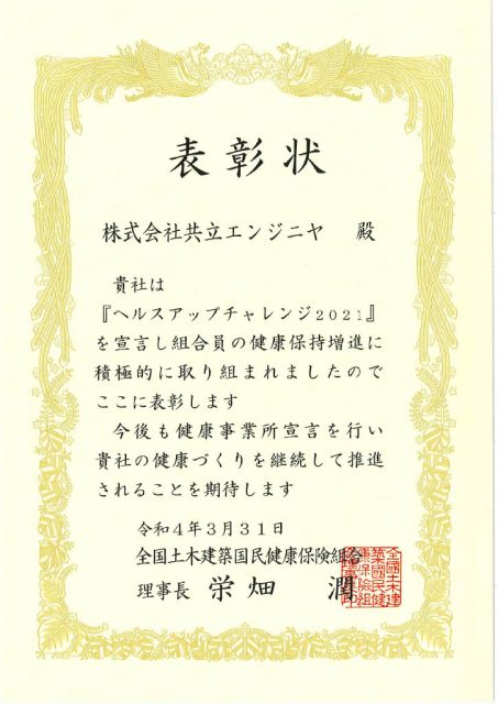 全国土木建築国民健康保険組合より「表彰状」を頂きました。