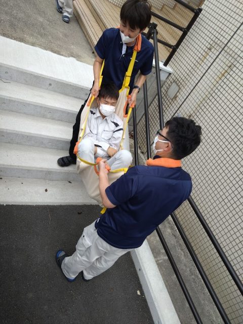 更に、担架を使った避難訓練は、意外に重く階段の昇降が大変なこと。
