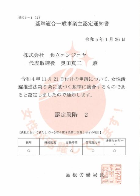 島根県内で第6号、土木建設業関連では初めての認定です。認定段階は2です。