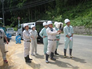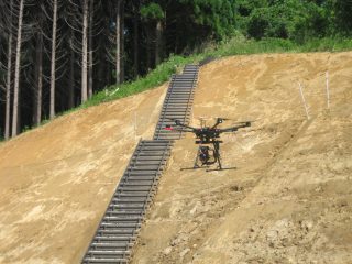 当日は発注者の松江県土土木工務第一課 引野係長・早志主任・中村技師の立会のもと当社UAV・MATRICE600での計測状況を確認して頂きました。