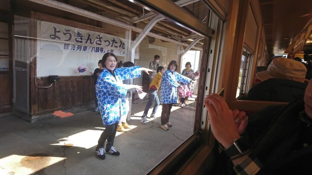 各停車駅でブラスバンドや地元ご婦人の踊りの歓迎を受けました。(餅に煎餅、干し柿やらいろいろ頂きました)