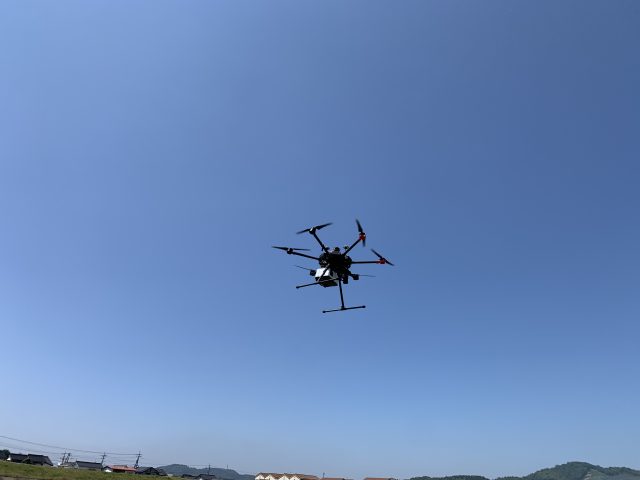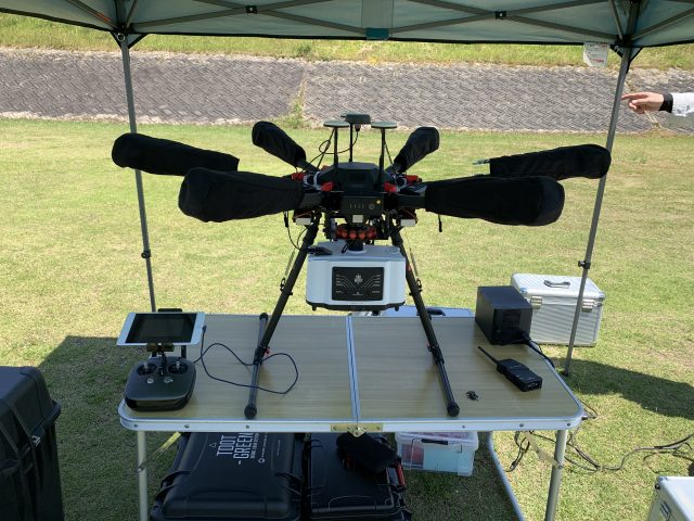 本日、倉吉市内の小鴨川掘削工事現場にてグリーンレーザー測量を実施しています。
