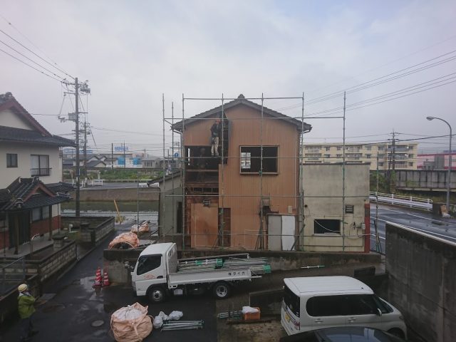 10/13 小雨の中、隣地解体工事の足場設置が始まりました。
