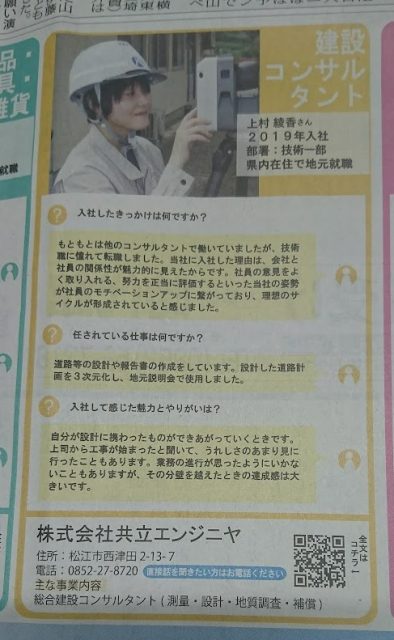 島根県の地元企業を紹介する「先輩のホンネ」に共立エンジニヤ技術1部上村さんが登場です。