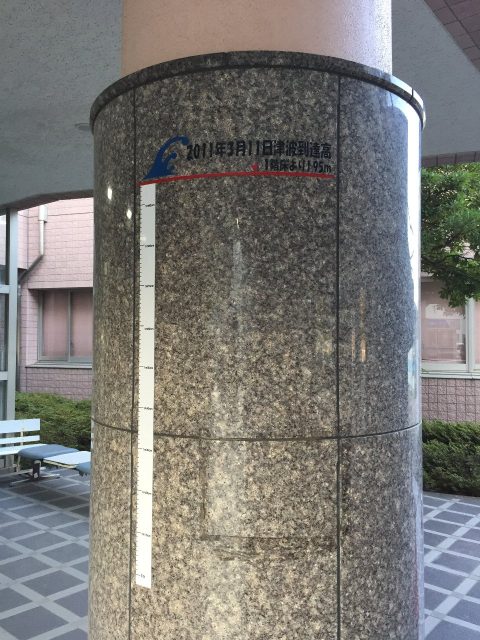 また、高台の病院へ行き門柱に津波の到達ラインが記載されているのを目にしました。