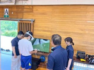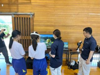 共立エンジニヤのブースではVR画像で3Dデータを使って、桜江中学校の生徒の皆さん一人ひとりにゴーグルをつけてもらい